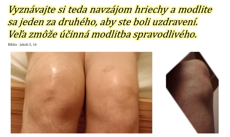 Na druhý deň ráno o 6 mi písala, že kolená už tak nebolia, aj keď sú ešte trochu opuchnuté. Ale už to nič nie je v porovnaní s tým, aké zlé to bolo. Veľmi sa tešila z tohto rýchleho uzdravenia a ďakovala Ježišovi. Mohla ísť aj do práce. Večer mi znova písala, že dokázala celý deň fungovať, ako keby nemala žiadny problém. A po práci pomáhala dcére s deťmi. Ďalšie dni tak isto mohla naplno riešiť všetko potrebné, ako keby žiadny problém nemala. Zlatka o tomto uzdravení hovorí aj všetkým blízkym a novým priateľom.
